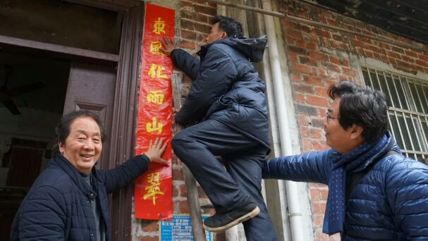 在过去的六年里,中国国家画院的艺术家坚持每年来到这里,习近平总书记指出:“一个国家、一个民族的强盛,总是以文化兴盛为支撑的。没有文明的继承和发展,没有文化的弘扬和繁荣,就没有中国梦的实现。”而书法则是中华文化传承千年的瑰宝,春联正是书法文化和中国民俗相结合的产物。今年,中国国家画院、广西书画院以及广西壮族自治区红十字会一行不仅为村民带来米、面、棉衣、棉服生活用品和两万元慰问金,艺术家还自带笔墨和纸张,在屏山乡农贸市场现场为当地百姓书写春联送上新春的祝福。